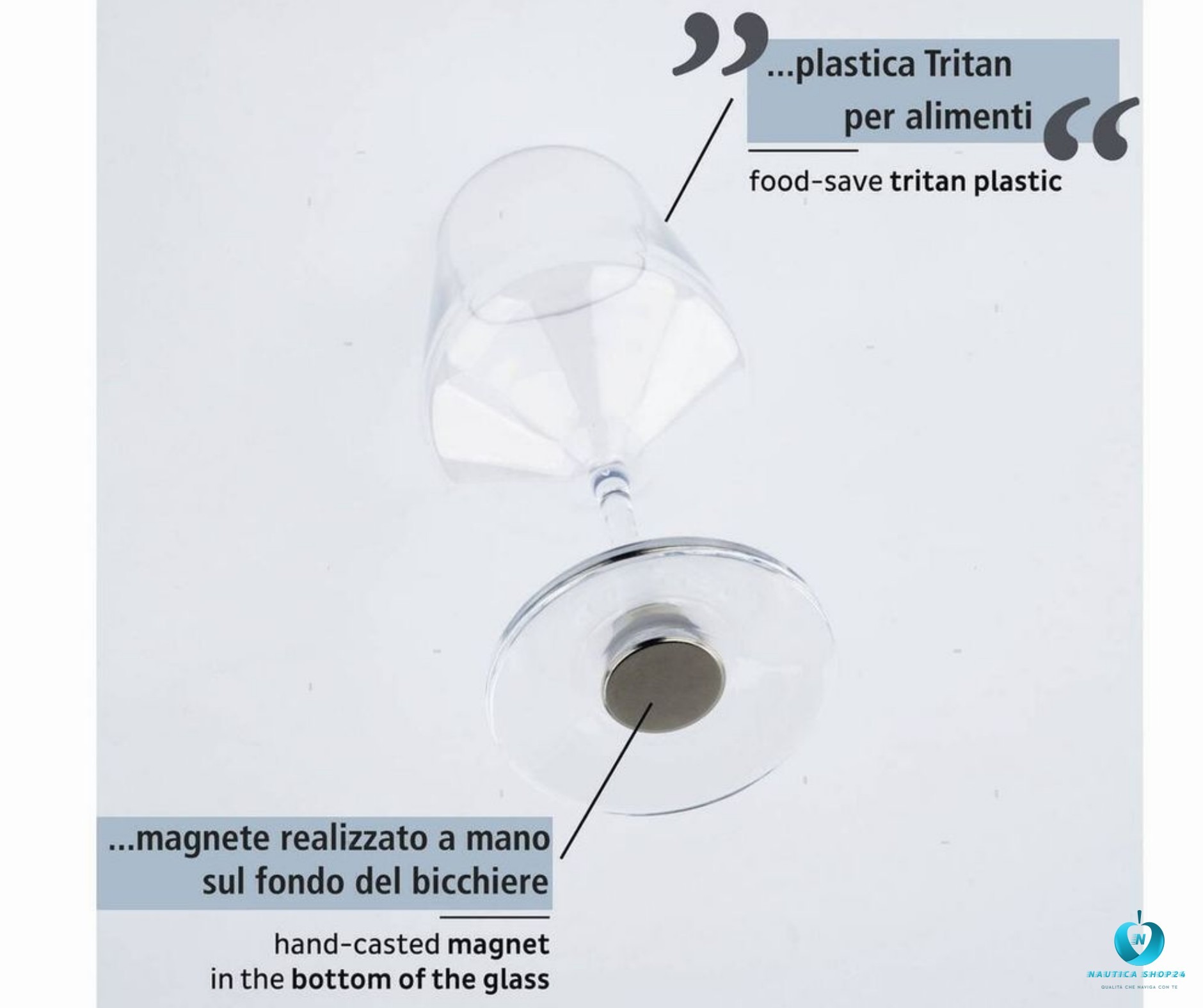 🛥️🍷 Calici da vino magnetici PL CLASS di Silwy sono bicchieri innovativi dotati di magnete integrato alla base, progettati per tenersi saldamente in posizione su superfici piane grazie a una piastrina metallica con nano-gel inclusa. Questo sistema evita spostamenti o ribaltamenti del bicchiere anche in situazioni di movimento o su barche e camper, rendendoli ideali per l’uso in viaggio o in spazi ridotti.